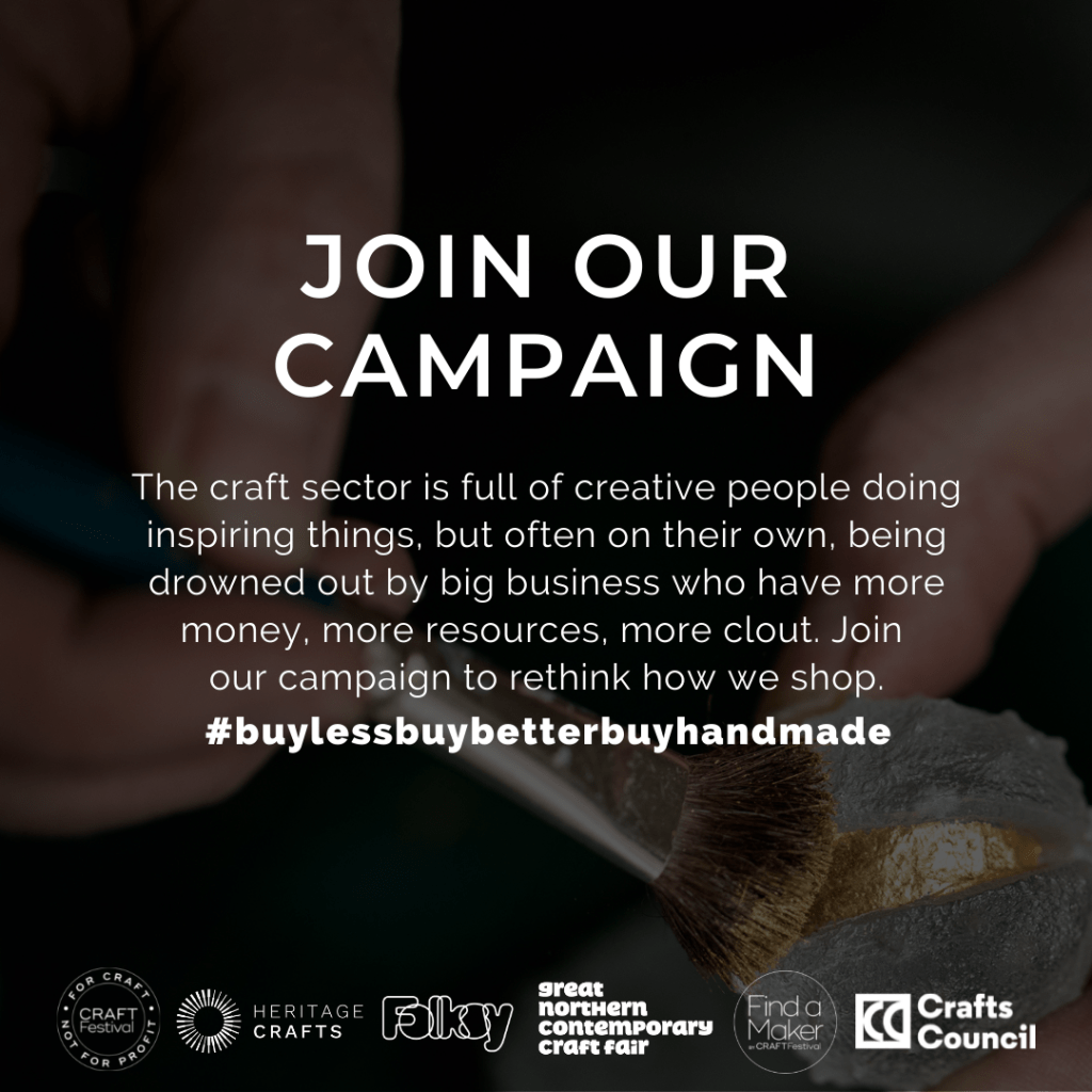 Folksy, Great Northern Contemporary Craft Fair, Craft Festival, Find a Maker, the Crafts Council and the Heritage Crafts Association pooled ideas and resources to come up with the idea. Working a little like the ‘Artists Support Pledge’, The campaign aimed to support makers and designers working in small businesses producing one-off and small batch produced goods by harnessing the power of collective advertising.